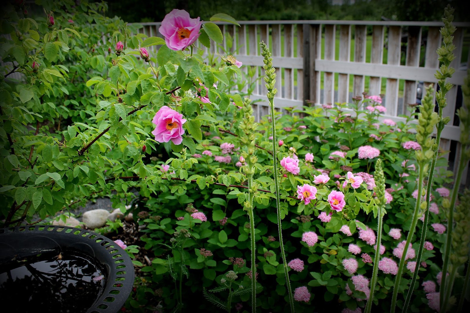 Kantaäiti. Kun muutimme tänne, pihan vanhan puolen edessä kasvoi kitulias, kuivunut juhannusruusu. Mies kaatoi sen moottorisahalla juuresta poikki ja pian se palkitsi meidät näin komealla kukinnalla. Otin tästä ison alun, kun pensas ja talo hävitettiin pihamuutosten tieltä.